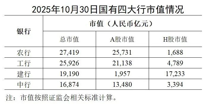 具体来看,截至10月30日收盘,农行、工行、建行、中行的总市值分别为2.74万亿元、2.59万亿元、1.92万亿元和1.69万亿元。