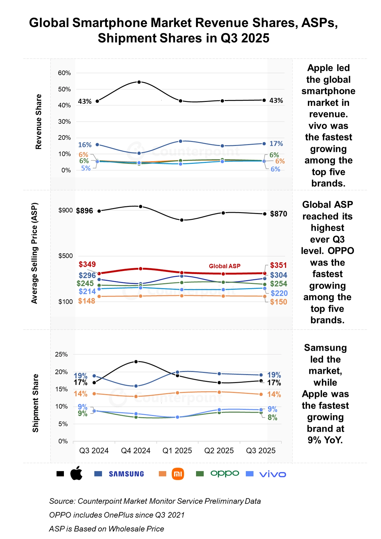 Counterpoint:今年 Q3 全球智能手机收入同比增长 5%,创下历史新高