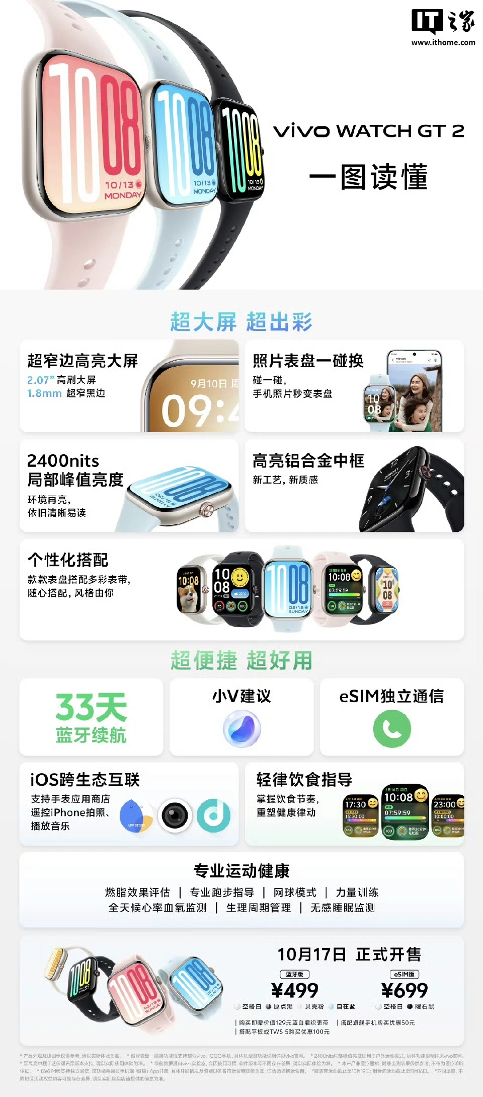 回顾 vivo WATCH GT 2 智能手表,该手表于 10 月 17 日开售,蓝牙版售价 499 元(国补价 424.15 元),eSIM 版售价 699 元(国补价 594.15 元),提供 2400nits 高亮高刷屏 + 全天候健康检测。其中手表 eSIM 版内置 595mAh 电池,蓝牙模式下续航可达 33 天,开启 eSIM 功能后续航根据使用频率,可满足日常 1-2 周充一次电。
