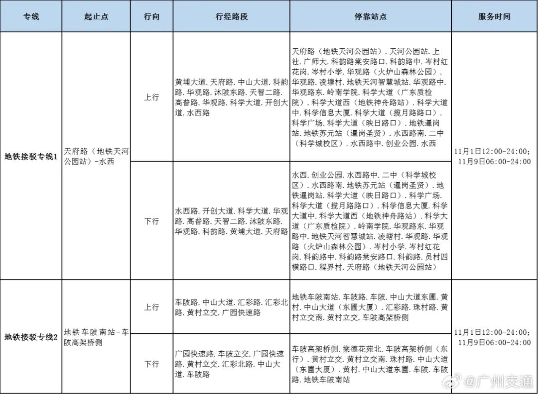 上述2条地铁接驳专线开行时间为11月1日12:00至24:00、11月9日06:00至24:00。此外,市交通运输部门还将重点加密天河区、黄埔区科学城区域常规公交发班班次,提升地面公交服务能力。
