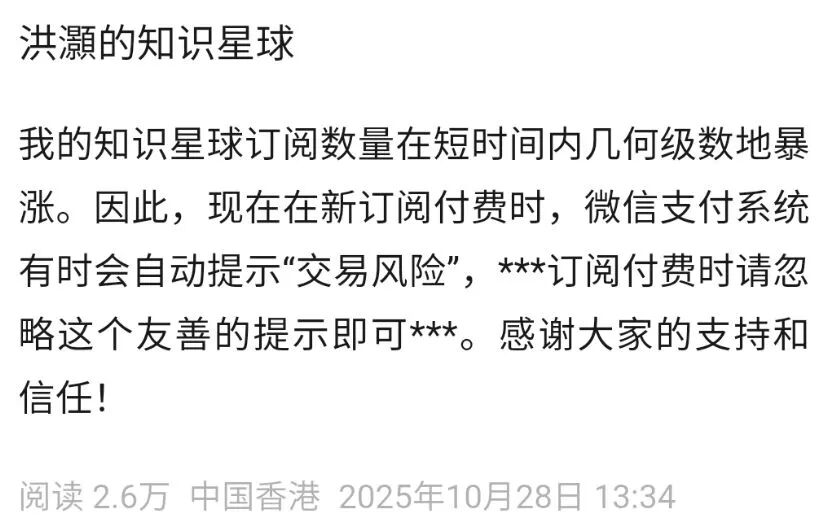 由于订阅用户短期内增长较快,甚至导致微信支付系统有时会自动提示“交易风险”,日前他还在个人微信公众号上就相关的付费问题发布了一则声明。