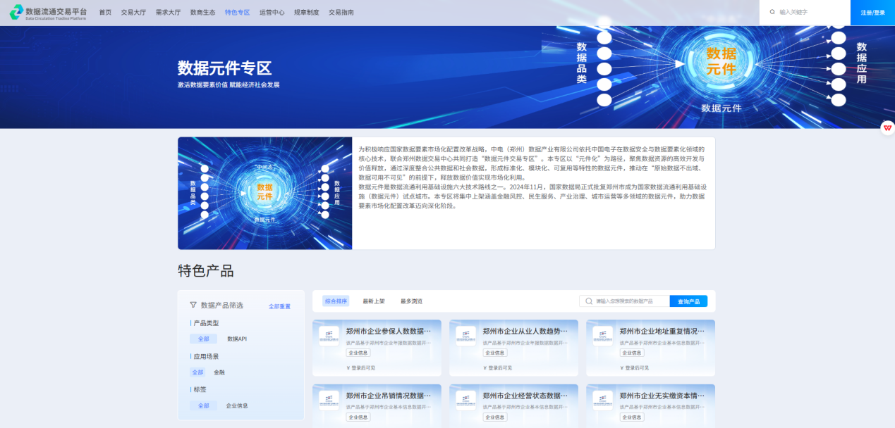 【大河财立方见习记者李雯雯】11月2日,大河财立方记者获悉,中电(郑州)数据产业有限公司(以下简称中电郑州)与郑州数据交易中心联合打造的“数据元件专区”近日正式上线运营。据了解,这是全国数据交易所领域首个聚焦数据元件的专业化交易板块,标志着郑州市在数据要素市场化配置改革领域完成先行探索。