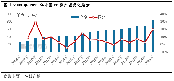 2025年是PP粉行业产能扩张收官年,全年新增150万吨产能,总产能达838万吨,较2024年增19.89%,较2021年累计增35.16%,五年年均增速7.03%。未来五年暂无新增产能规划,行业将从规模扩张转向质量提升,进入存量竞争阶段。