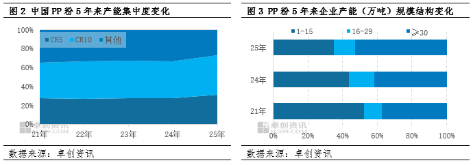 由于行业特性,PP粉产能呈现企业数量多、规模小的特点。虽近年来连续法工艺的出现使得新投产装置的产能显著增大,但暂未能撼动头部企业的行业地位。早期,PP粉企业依赖国产间歇式液相本体法生产,由于该方法投资少,催生一大批小规模PP粉企业。然而随着外采丙烯企业成本面压力增加,小规模企业生产及经营压力增加。与此同时,连续法工艺因其更低的生产成本和更高的产能,正逐渐成为新投产装置的首选,进一步推动行业升级。2025年中国PP粉CR5企业产能集中度为45.7%,较2024年增加8.07个百分点;大型化设备占比整体有所增加,2025年30万吨以上PP粉装置占比为52.86%,较2024年增长10.95个百分点,较2021年提高15.28个百分点。