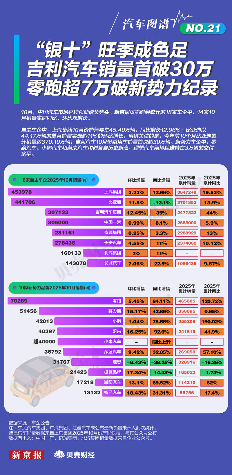 10月中国汽车市场延续强劲增长势头。新京报贝壳财经统计的18家车企中,14家10月销量实现同比、环比双增长。