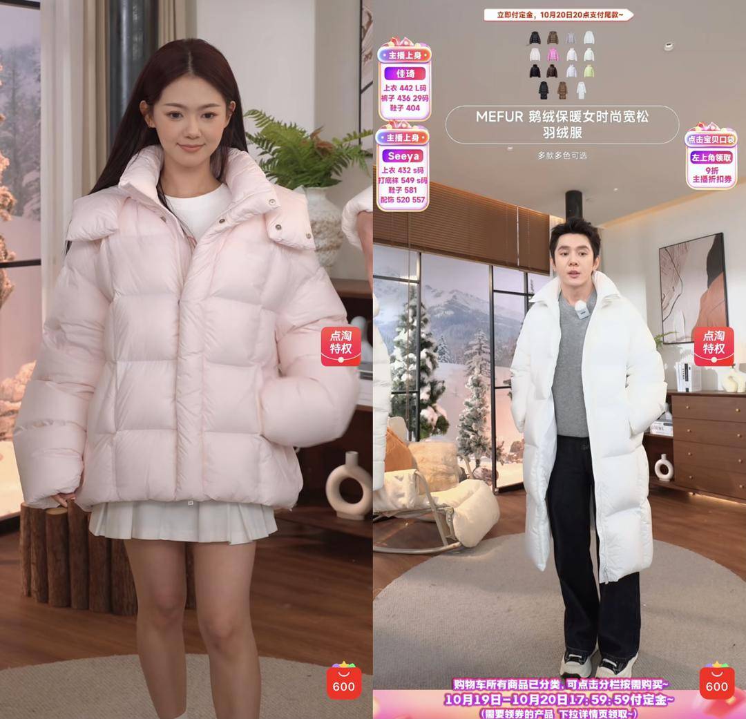 伴随全国范围降温,羽绒服与冲锋衣成为直播间热门产品。其中,羽绒服在女装销售中占比高达60%,直接带动女装整体板块增长。