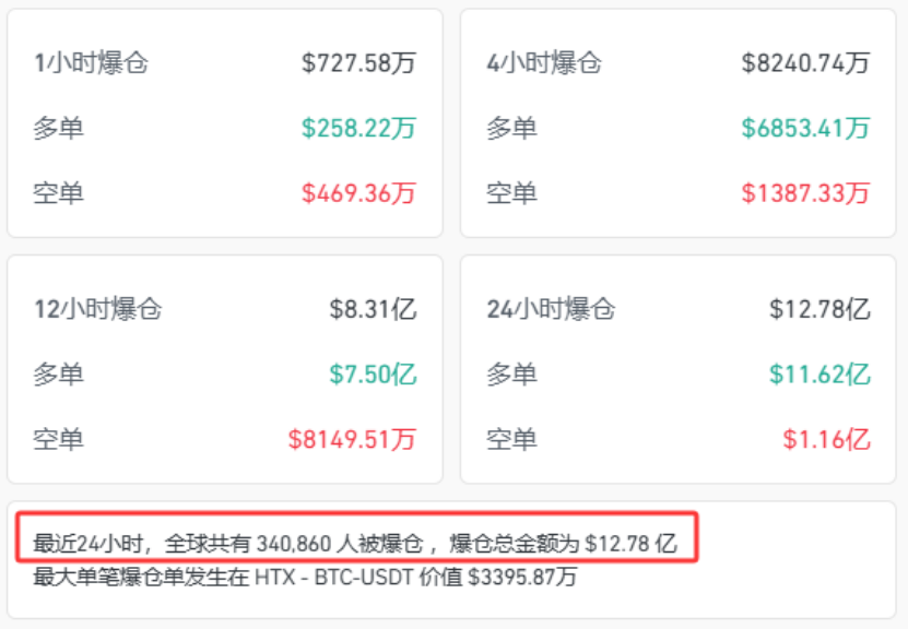 Coinglass数据显示,过去24小时内,加密货币市场全网合约爆仓超12亿美元,爆仓人数超过34万人,其中超九成为多单爆仓。