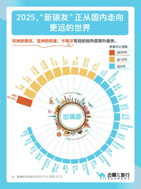 平台数据显示,2025年1至9月份,以“65后”为代表的新生代银发族对于各种“网红打卡”目的地或景点的关注度显著上升,包含相关景点的银发游线路预订热度同比增长超200%。另外,年轻人追捧的“奔县游”在“新银发族”群体中的热度也在快速上升。过去两周,银发用户(50岁以上)国内热门县级目的地酒店的预订热度环比增幅普遍超过200%。今年,去哪儿平台上,“新银发一族”预订机票增长最快的小城包括内蒙古乌兰察布、河北邢台、新疆奇台等,分别增长了9.4倍、8.6倍和5.5倍。此外,河南安阳、湖南湘西、湖北十堰等目的地也开始吸引更多的老年旅客。