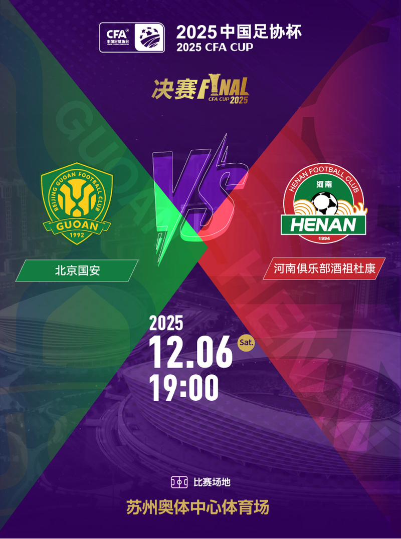 新京报讯 据北京国安足球俱乐部消息,2025年12月6日19时,中国足协杯决赛将于苏州奥体中心体育场进行,北京国安将对阵河南俱乐部酒祖杜康。