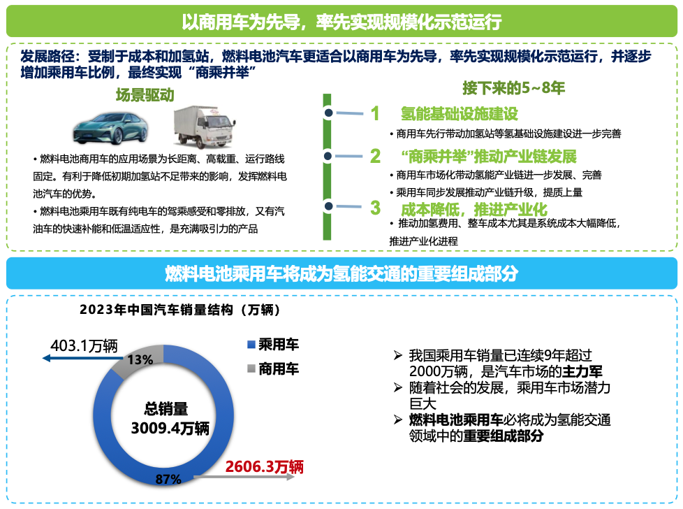 陈金锐认为,结合乘用车在交通领域的特殊市场地位(我国乘用车产销量占汽车总产销量比重在80%以上,年产销总量高达2000余万辆),待国家政策体系与氢能基础设施建设进一步完善后,乘用车领域必将成为氢能交通领域中的重要组成部分。因此,应坚定“商乘并举”的发展路径,推动燃料电池乘用车产业升级,提质上量。