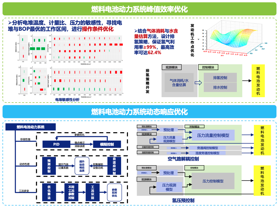 中国第一汽车股份有限公司研发总院燃料电池发动机开发领域经理王宇鹏提出:“燃料电池动力系统需从峰值效率和动态响应两方面进行优化。峰值效率方面,通过分析电堆温度、计量比、压力的敏感性,寻找电堆与BOP的最优工作区间并进行操作条件优化,结合排氢策略设计,可实现氢气利用率≥99%且最高效率可达62.4%;动态响应方面,借助 PID、模糊控制等多种方法,可提升动力系统动态响应性能,系统动态加载可达50kW/s。”