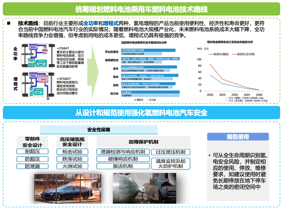 深蓝汽车科技有限公司燃料电池系统开发总监、长安燃料电池整车项目总监陈金锐认为,燃料电池乘用车技术路线主要有全功率和增程式两种。增程式产品目前在使用便利性、经济性与寿命上更契合国内行业实际;全功率路线随着燃料电池产业规模化,系统成本大幅下降后竞争力将提升。此外,还需从零部件安全设计、高压储氢瓶安全设计、故障保护机制以及规范使用等多方面,强化氢燃料电池汽车安全保障。