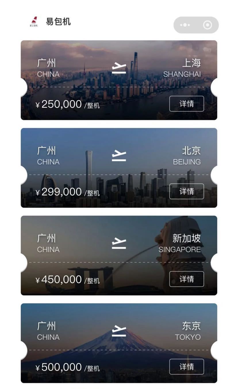 此前在第八届广州商务航空展上,JETBAY掌上包机与广东翼通商务航空合作推出了“易包机”微信小程序。通过手机,用户可以完成从航班查询、机型选择、航班报价到服务定制、在线支付的全流程,预定流程可以缩短至8分钟内。