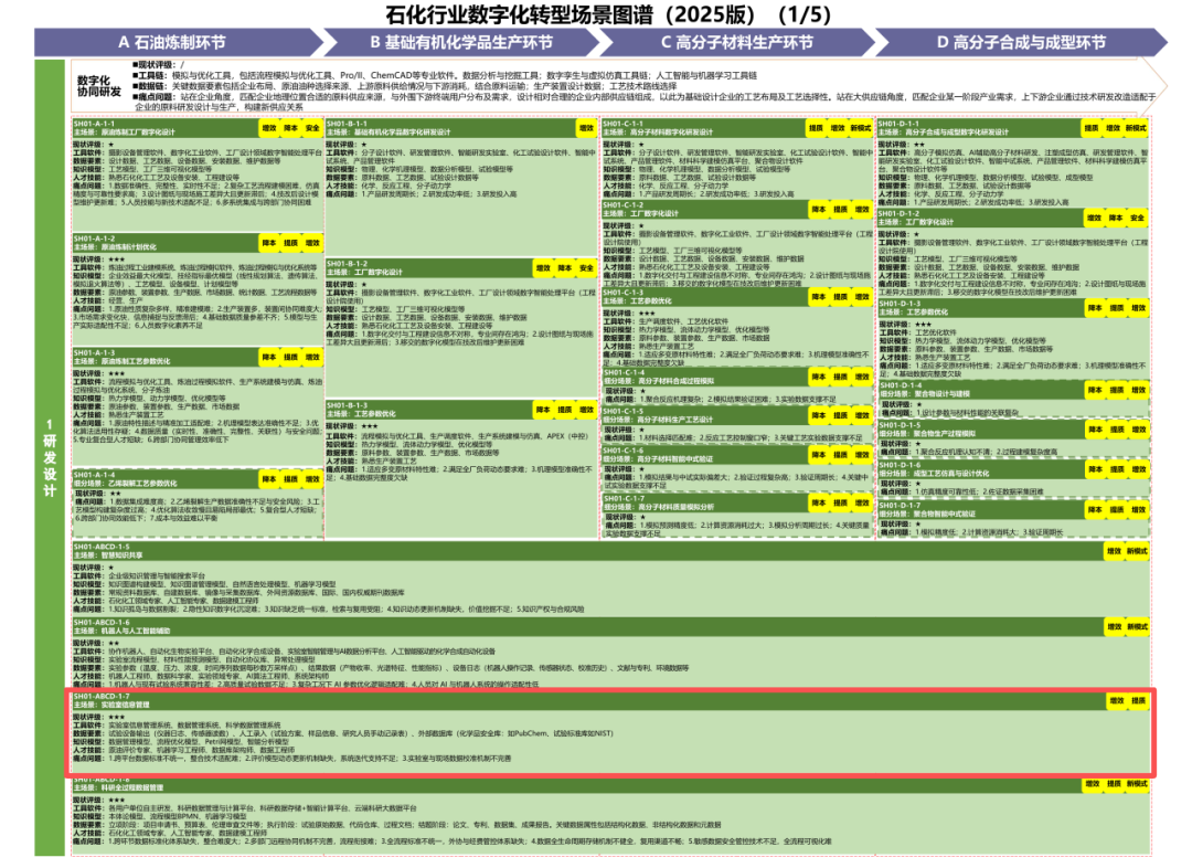 9月16日,工业和信息化部印发《场景化、图谱化推进重点行业数字化转型的参考指引(2025版)》,发布14个重点行业场景图谱,为行业数字化转型实践提供了科学指引。石化行业数字化转型场景图谱围绕石油炼制、基础有机化学品生产、高分子材料生产、高分子合成与成型等重点环节,重点关注研发设计、生产制造、运维服务、经营管理、供应链管理等业务活动,深度剖析78个数字化主场景和12个细分场景,梳理223项工具软件、159项知识模型、146项数据要素和82项人才技能,综合呈现石化行业数字化协同与各要素流转贯通。现对石化行业“SH01-ABCD-1-7 实验室信息管理”典型场景进行解读。