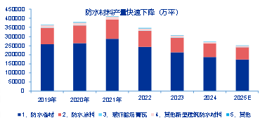 如果我们去看,从2021年地产开始进入下行周期以来,这四五年的时间,在一些建材当中偏资本开支较重的行业,其实已经有一定的自发性出清。比如防水,它是消费建材中一个非常重要、有代表性的子行业。我们可以看到,从2021年到2024年,防水材料产量的下降速度非常快,且趋势非常明确,这个行业的集中度在此过程中也有了非常大幅的提升。