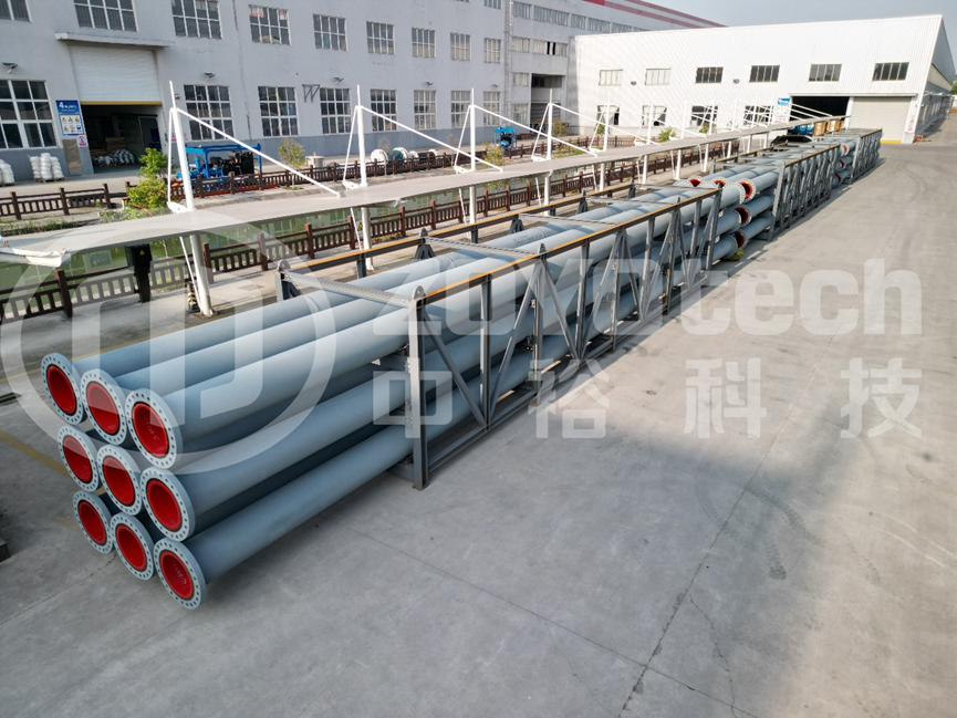 中裕科技自主研发的18米超长钢衬聚氨酯(884039)耐磨管,每根管道重约3.5吨。该管道主要应用于矿产开采、疏浚等高耐磨、高腐蚀的苛刻工况,既满足了客户对浆体管道超长服役寿命的需求,也节约了大量的现场安装成本,同时还减少了管道因法兰接头过多带来的流体泄漏的风险,可谓降本增效、一举多得。
